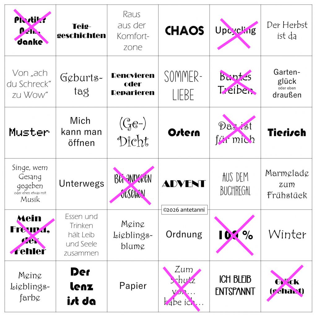 Seit dem 28.März sind die Zeigetage vom Bingo das Anita veranstaltet, und so sieht meine Bingotafel inzwischen aus.